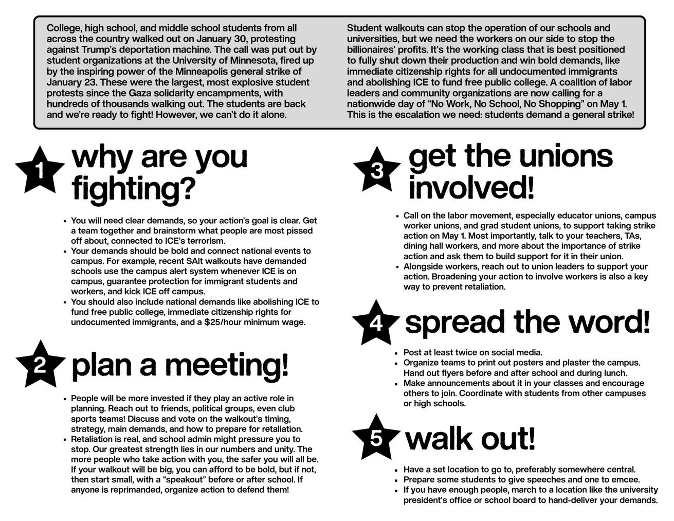 * Students and workers must come together in general political strikes, and build united multi-racial, multi-gender, and multi-ethnic working class organizations that bring the full weight of our class to bear on the repressive capitalist class.
